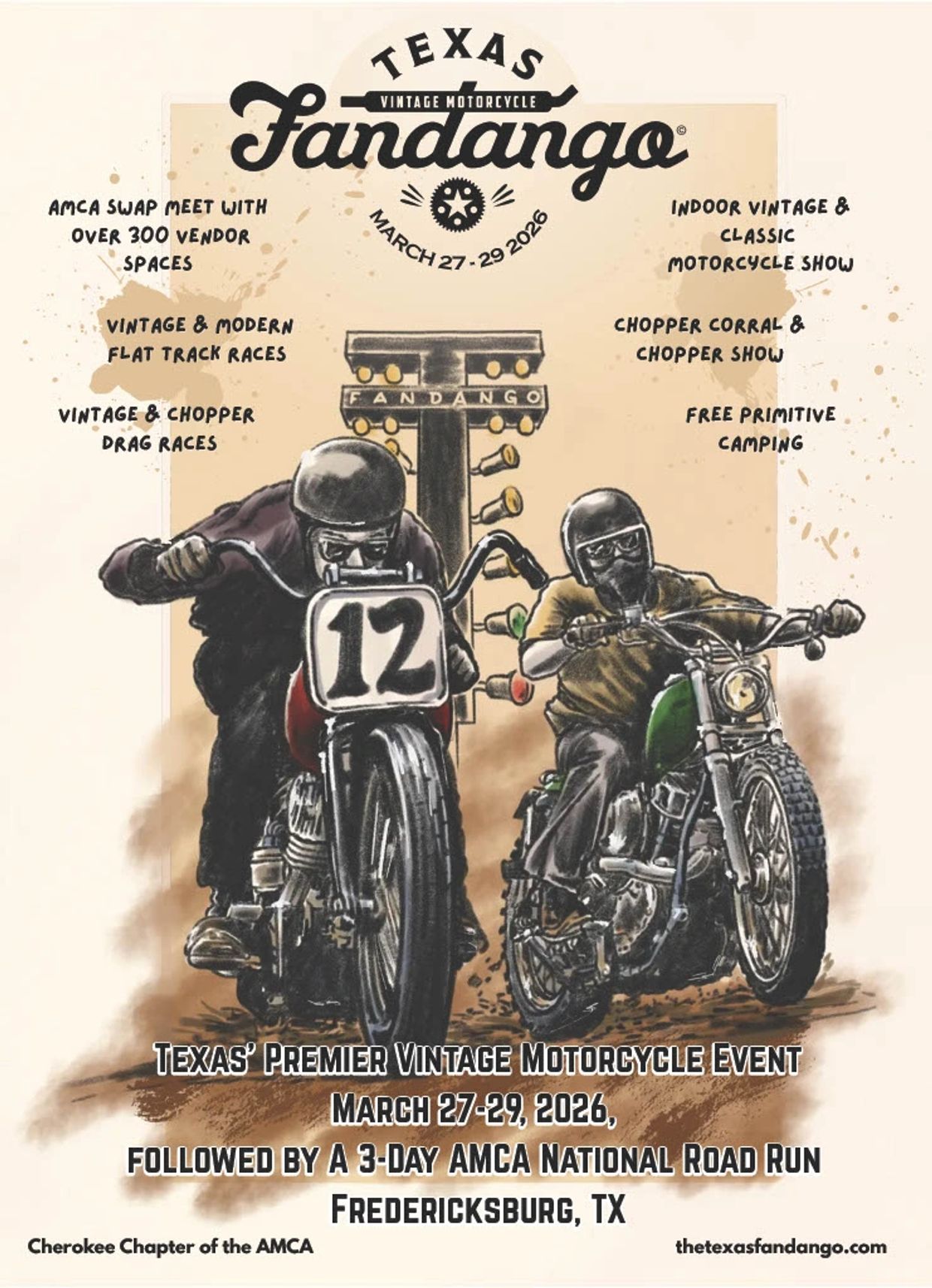 The Cherokee Chapter of the AMCA proudly presents The Texas Fandango. The Texas Fandango is a vintage swap meet, vintage bike show, and vintage races all rolled into one fun-packed weekend happening on March 27-29, 2026. The Fandango is located in the beautiful Texas Hill Country at the Gillespie County Fairground in historic Fredericksburg. The premier event in Texas for any vintage motorcycle enthusiast. A portion of every ticket sold benefits the Optimist Club of Fredericksburg, Texas. General admission access is available at the gate for $20.00 per person. Active military members or veterans can gain entry for $10.00 with a valid ID at the gate. Children twelve and under can enter for free. Enjoy complimentary primitive camping with your Fandango wristband. The Fandango is a rain or shine event. No Club Colors / Soft Colors are allowed. Please follow us on Instagram and Facebook for community photos and updates.